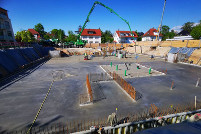 Ende April 2025 wird die Bodenplatte gegossen und geglättet.
